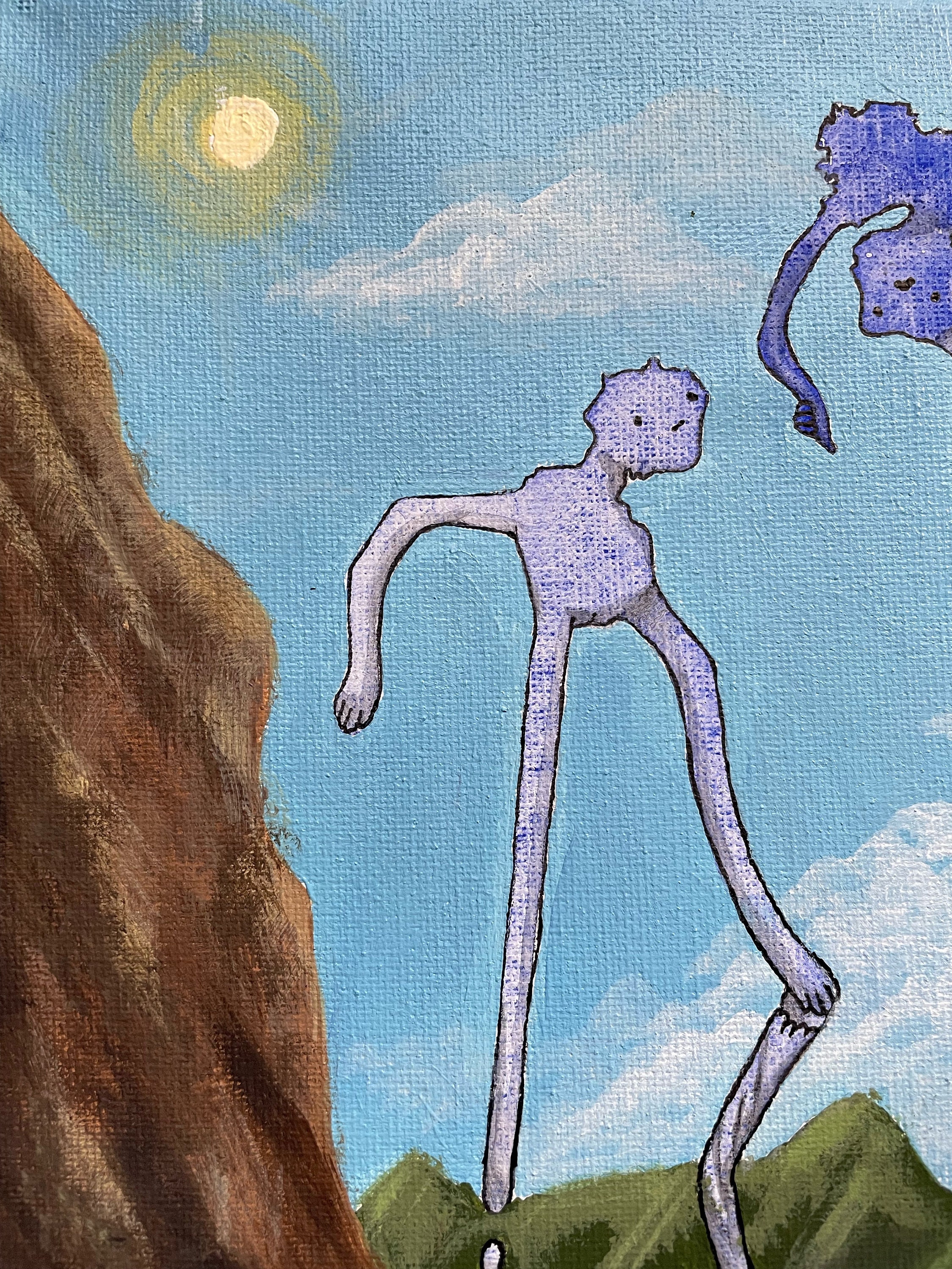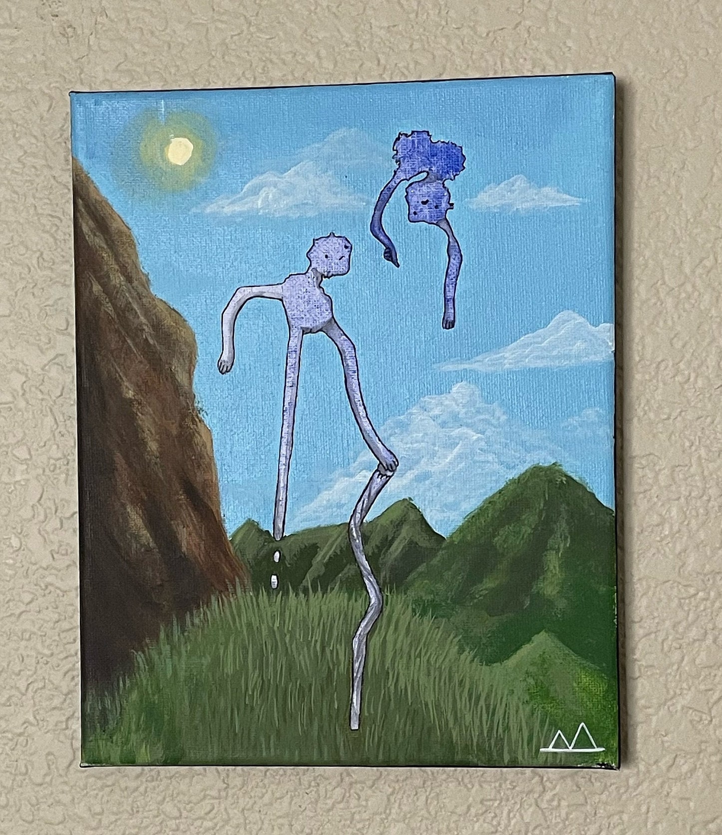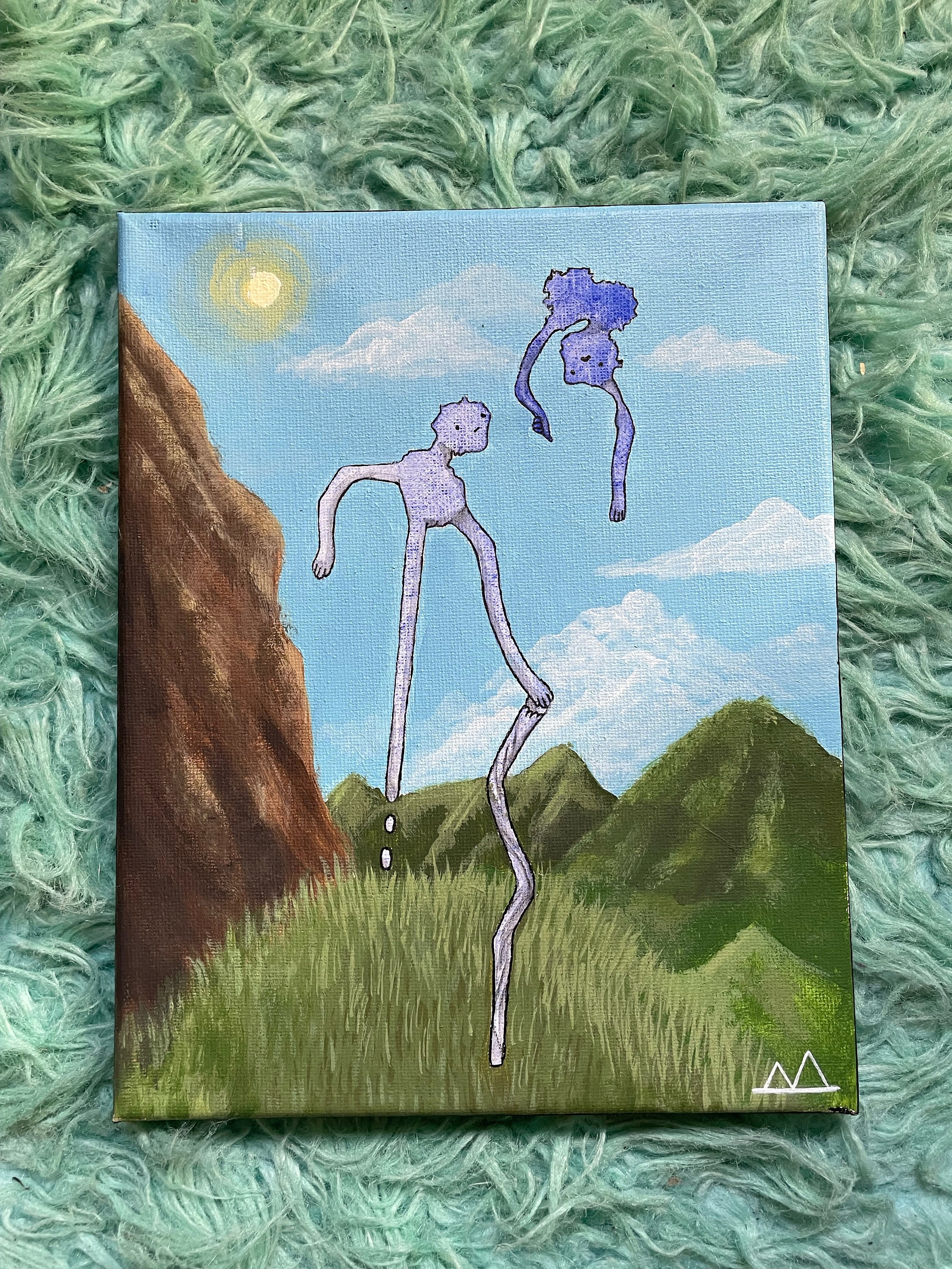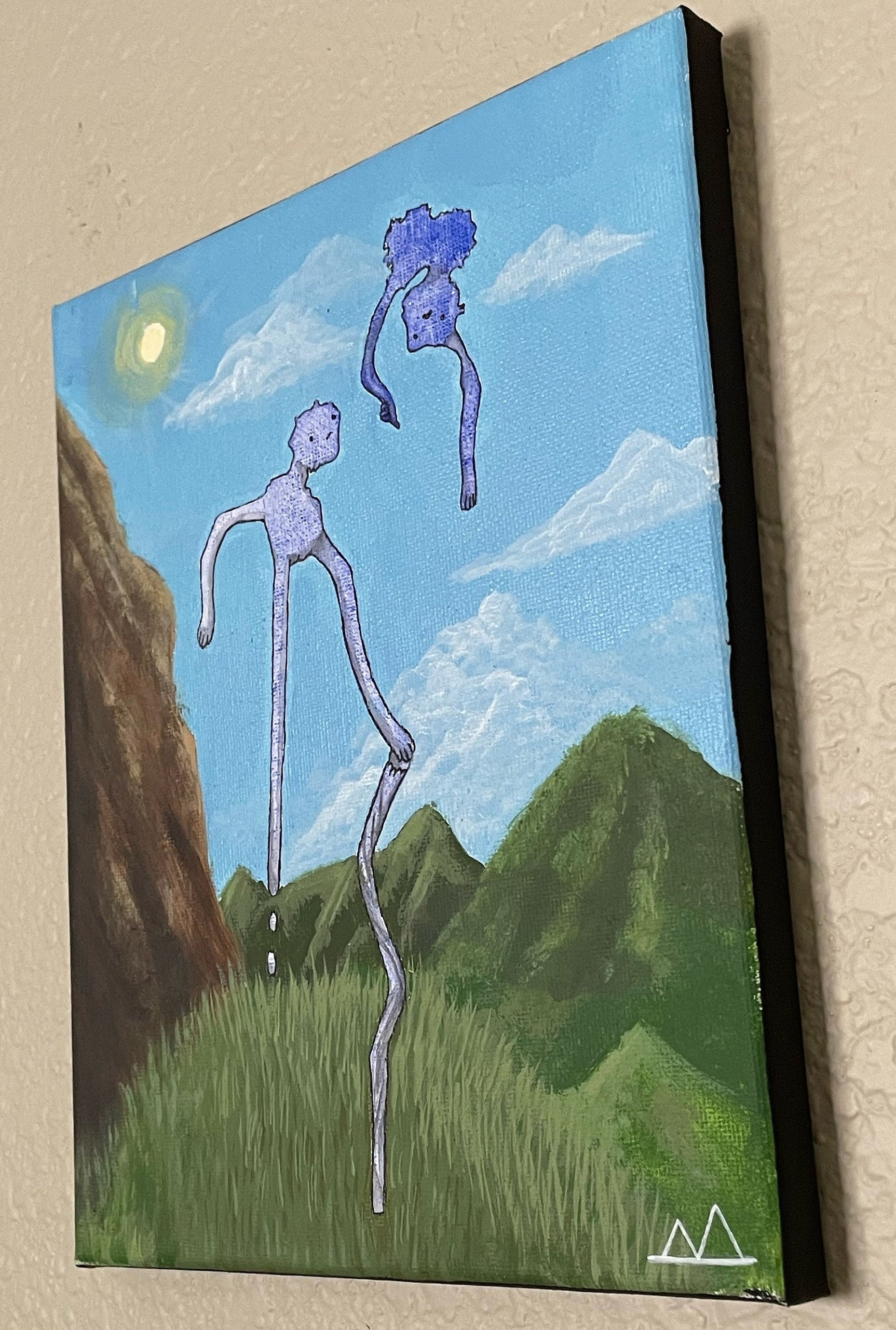 Original painting. Materials used are watercolor paint, acrylic paint, Micron fine liners, and graphite pencils on a stretched canvas. This Drip Monster is wandering up a mountain path to get far away from civilization. His magic is no longer under his control and he encounters his self from another dimension.