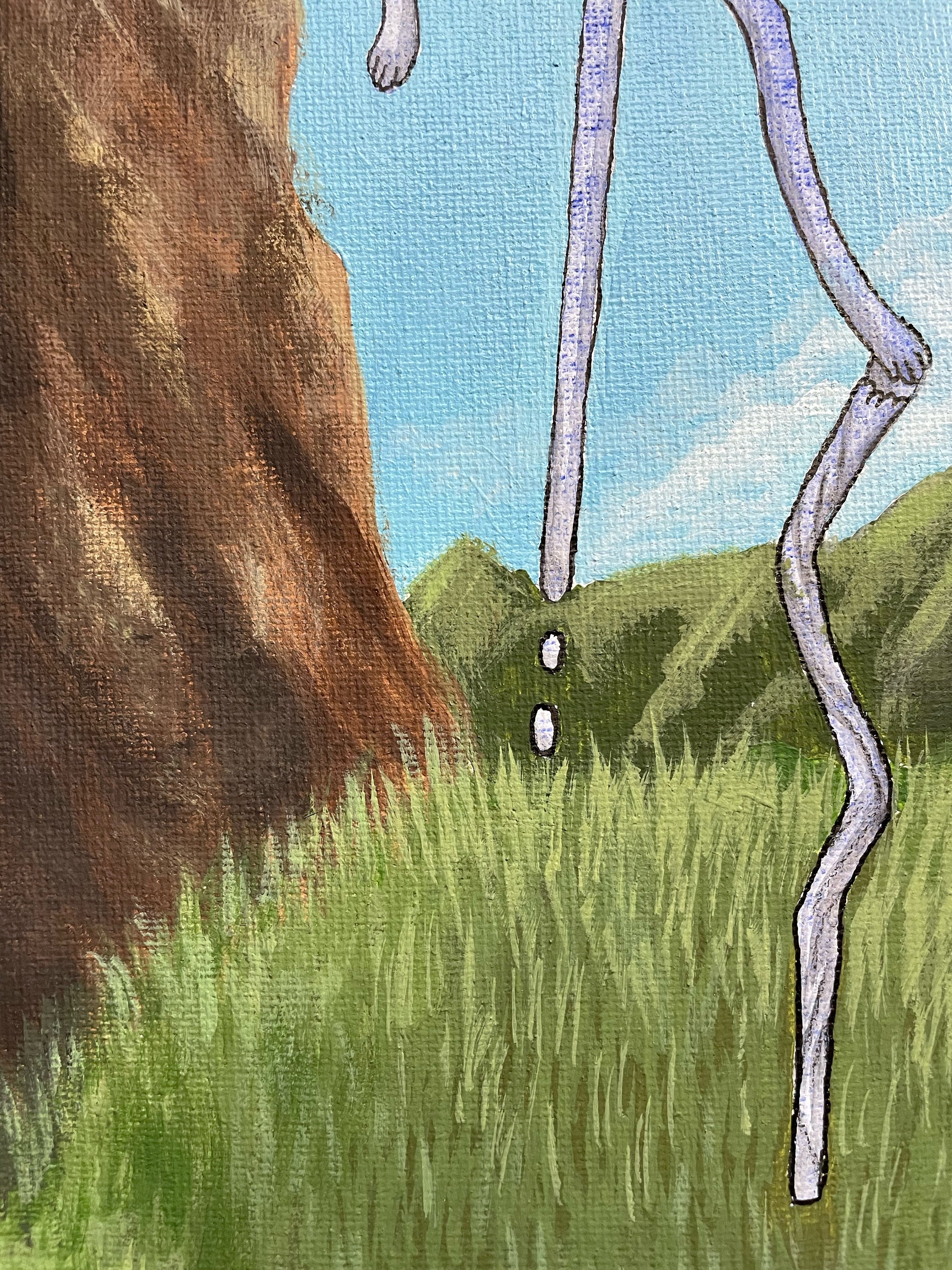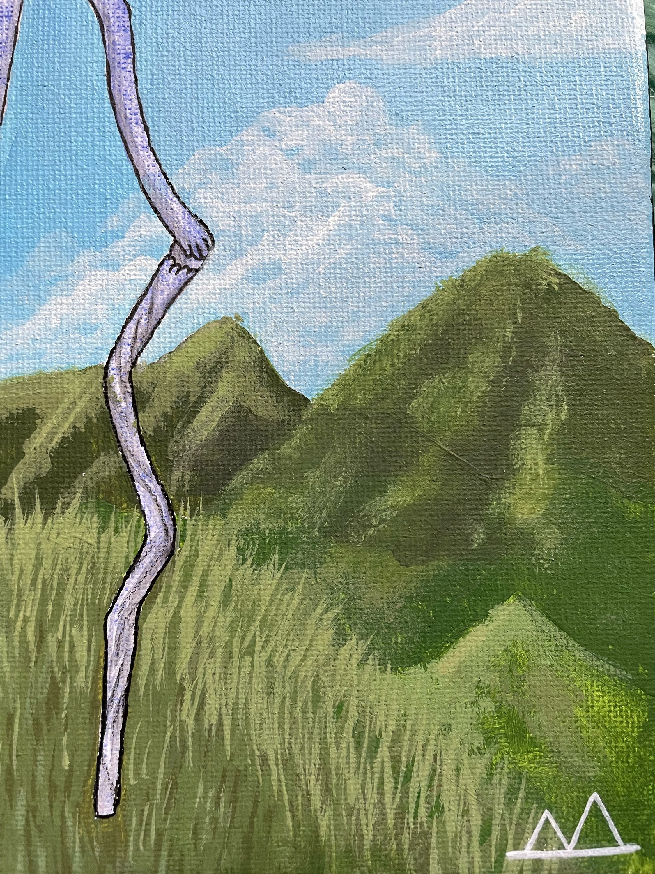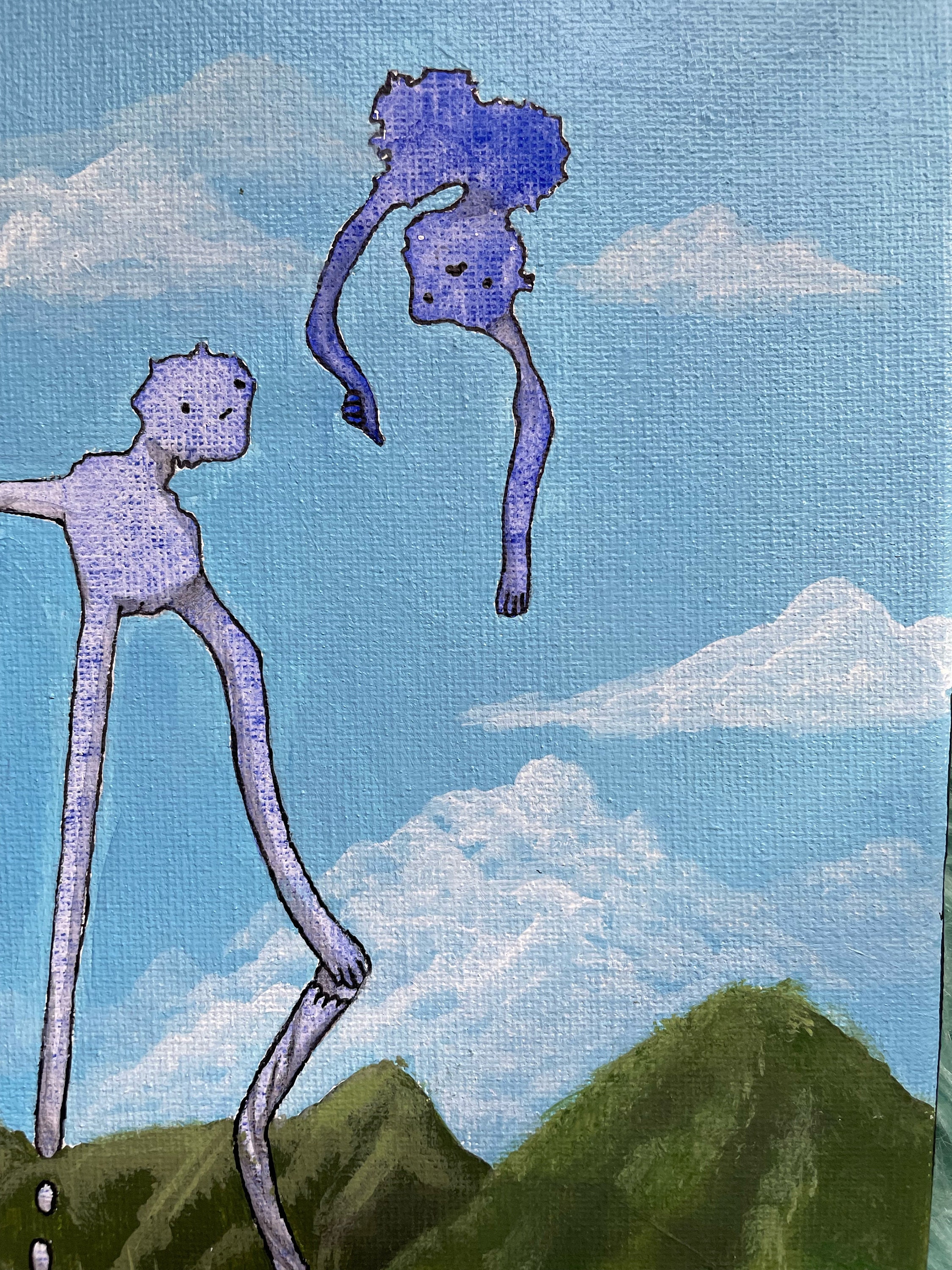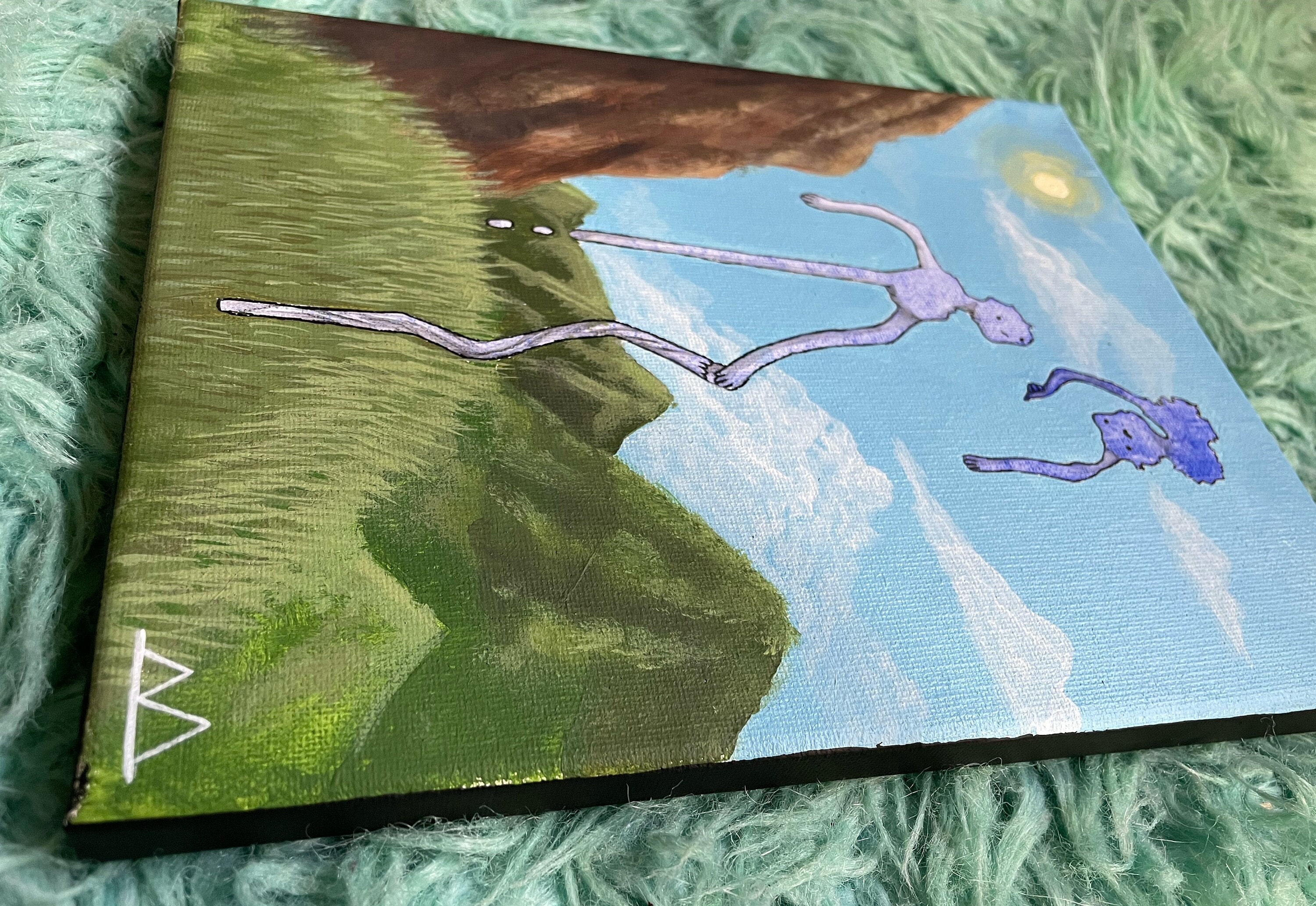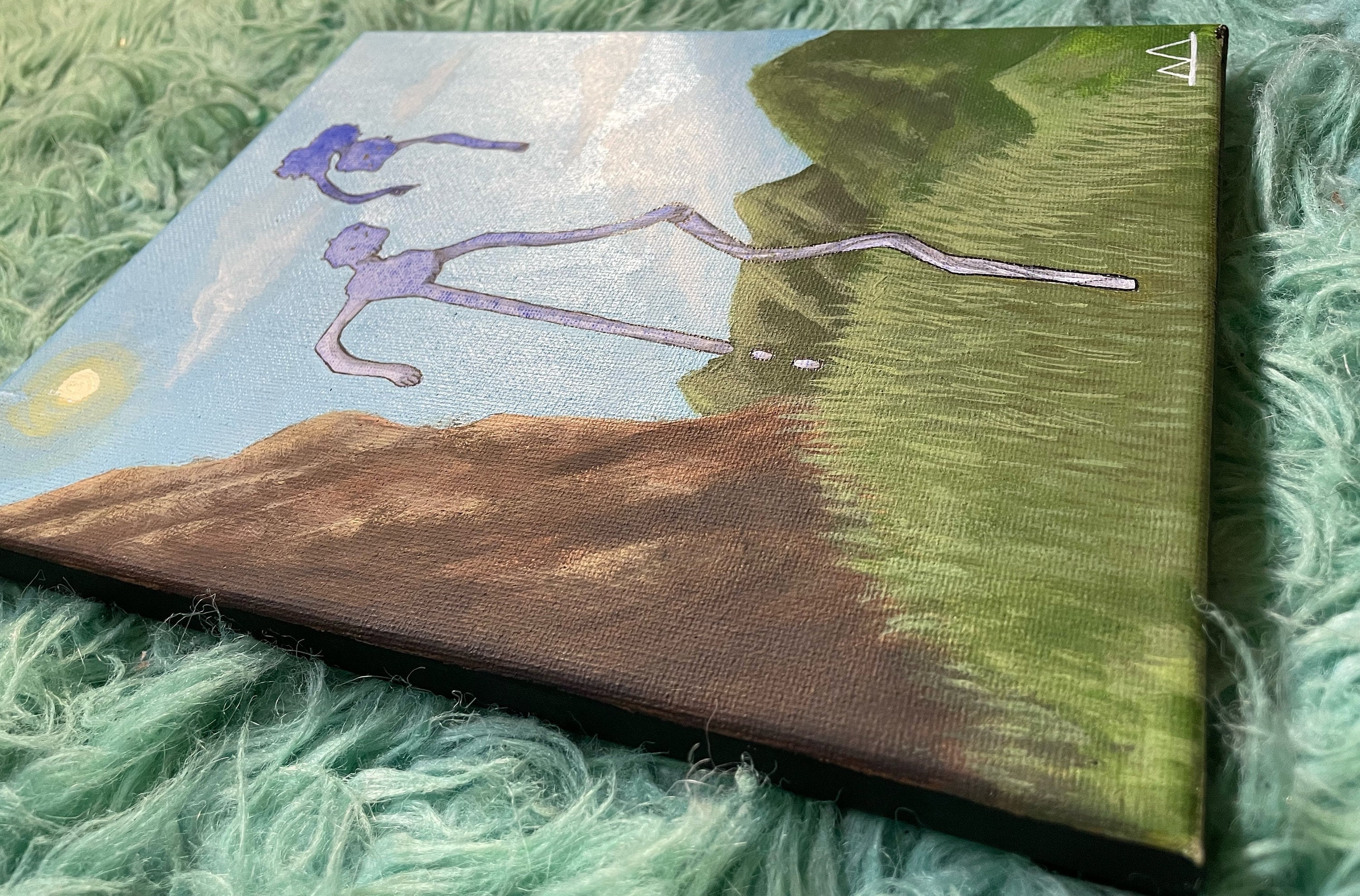 Original painting. Materials used are watercolor paint, acrylic paint, Micron fine liners, and graphite pencils on a stretched canvas. This Drip Monster is wandering up a mountain path to get far away from civilization. His magic is no longer under his control and he encounters his self from another dimension.